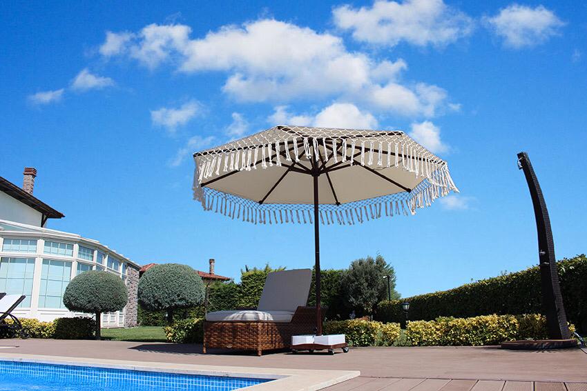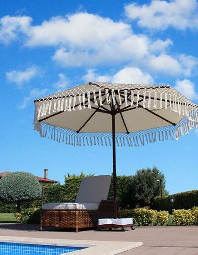Design Macramé Ensorcelant : Ce parasol éblouit par son design subtil en macramé, ajoutant une touche d’artisanat raffiné à votre espace extérieur. Un véritable chef-d’œuvre qui célèbre l’harmonie entre nature et art.